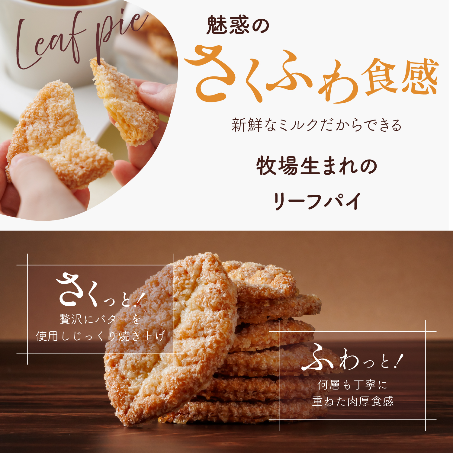 牧場の新鮮なミルクを使ったリーフパイは、贅沢で香ばしい味わいが魅力。バターの風味が際立つサクサクの食感が特徴で、豊かな自然の恵みを感じさせる焼き菓子です。午後のお茶のお供に最適。よくある市販のリーフパイより一回り大きく肉厚で、1枚でも大満足の食べ応え。